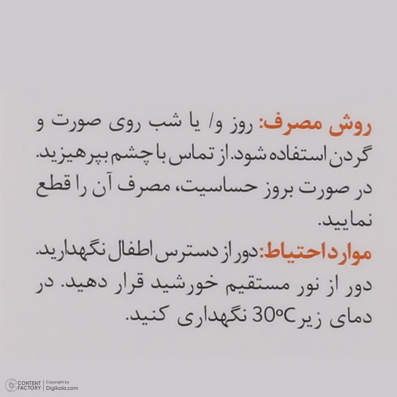 صبح یا شب روی صورت و گردن استفاده کنید. از تماس با چشم خودداری کنید.