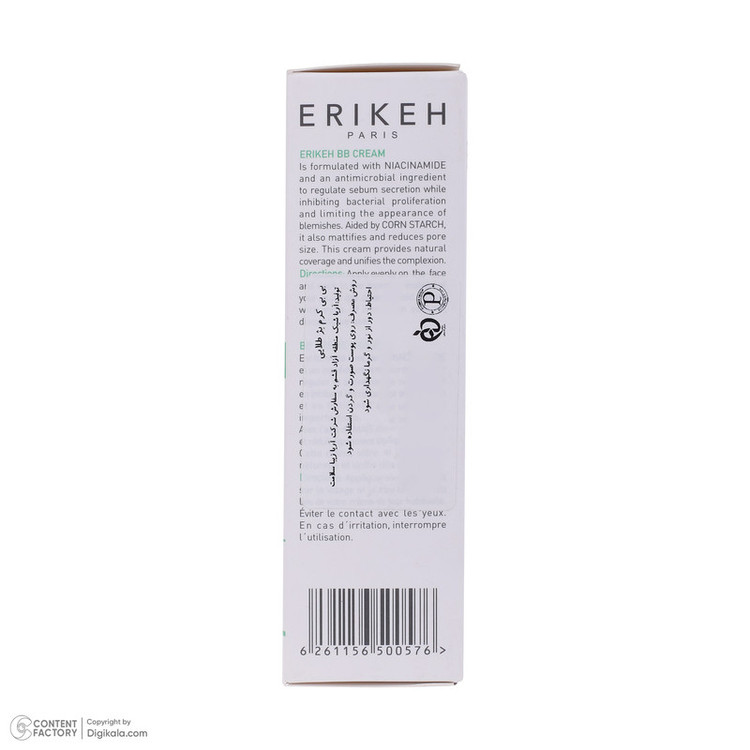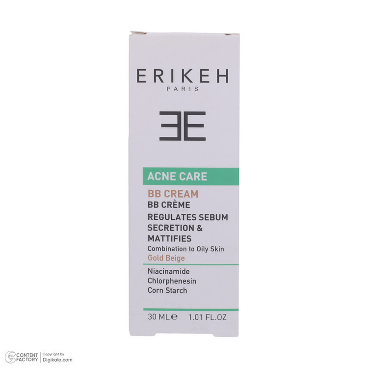 بی بی کرم ضد آکنه رنگی اریکه، مناسب پوست مختلط تا چرب است و ترشح سبوم را کنترل میکند. بی بی کرم ضدآکنه رنگی ERIKEH از برق زدن پوست جلوگیری نموده و با مبارزه با باکتریها، از بروز جوش و آکنه جلوگیری میکند. بی بی کرم ضد آکنه رنگ بژ طلایی ERIKEH، مناسب پوست مختلط تا چرب است. BB کرم اریکه منافذ باز پوست را جمع کرده و نواقص صورت را میپوشاند. بی بی کرم ضد آکنه رنگ Gold Beige اریکه حاوی نیاسینامید بوده و باکتریهای مولد جوش و آکنه را از بین میبرد. نیاسینامید یا همان ویتامین B3 موجود در این محصول تولید کلاژن در پوست را نیز افزایش داده و روند پیری پوست را کند میکند. این ویتامین لکهای پوست و قرمزی را از بین میبرد و از پوست در برابر اشعههای مضر خورشید محافظت مینماید. همچنین این محصول براقی پوست را رفع نموده و عملکرد سد دفاعی پوست را تقویت میکند. بی بی کرم پوست رنگی چرب اریکه حاوی کلرفنزین و نشاسته ذرت بوده و غدد ترشح چربی را کنترل میکند.
