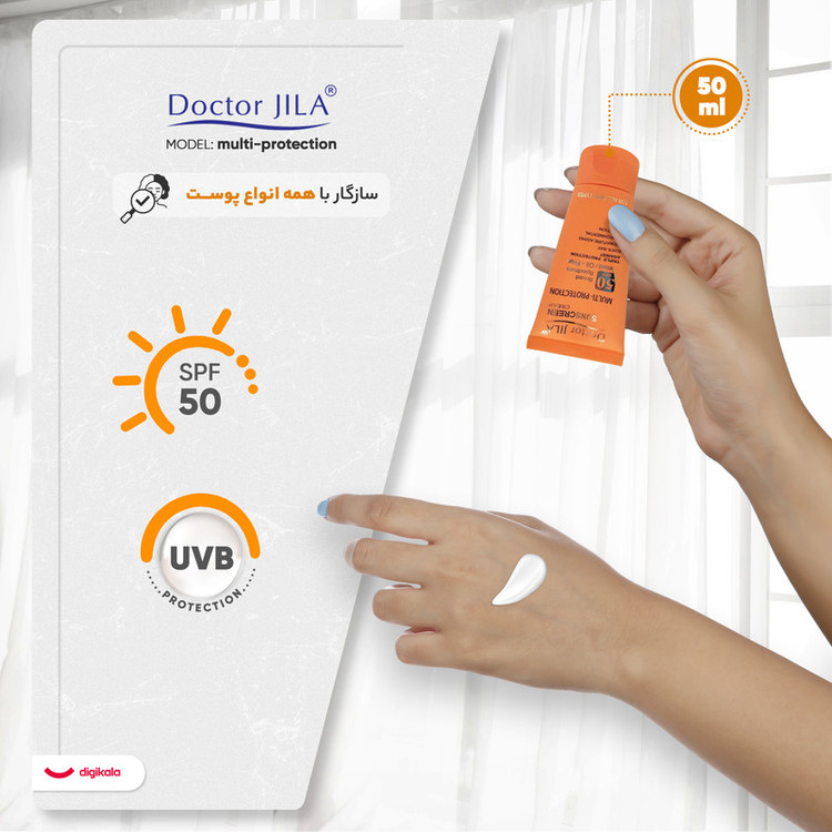 کرم ضد آفتاب بدون رنگ دکتر ژیلا SPF50 مدل multi-protection محافظ UVB، مرطوبکننده، مناسب انواع پوست حجم 50 گرم
