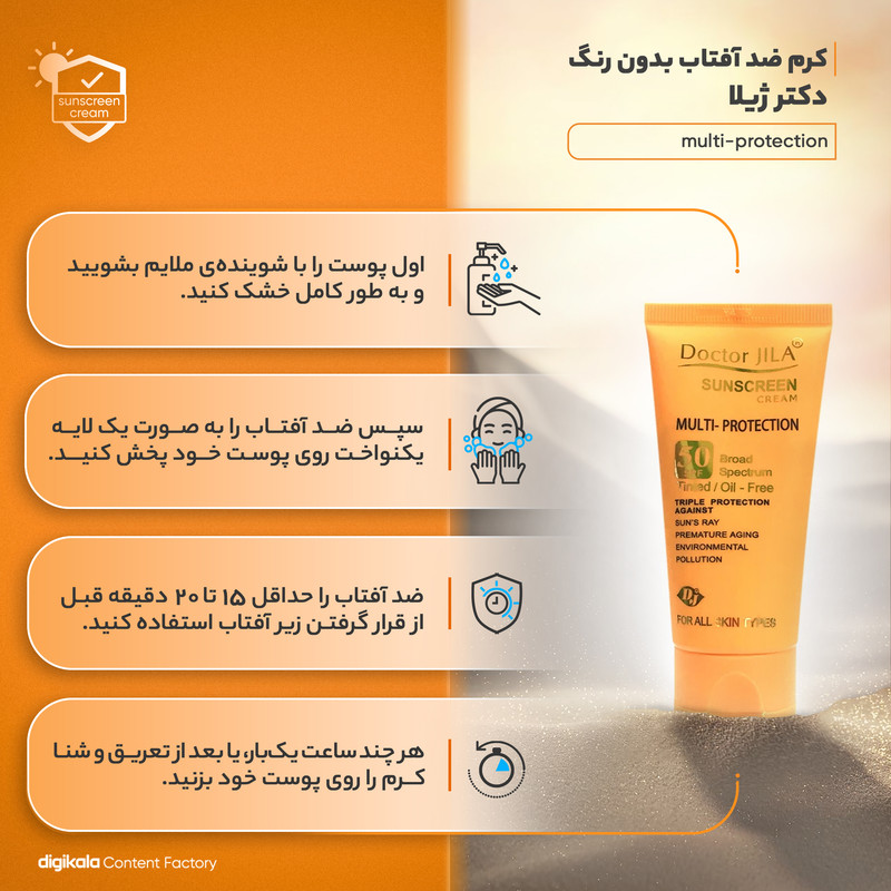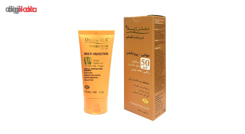 کرم ضد آفتاب بدون رنگ دکتر ژیلا SPF50 مدل multi-protection محافظ UVB، مرطوبکننده، مناسب انواع پوست حجم 50 گرم