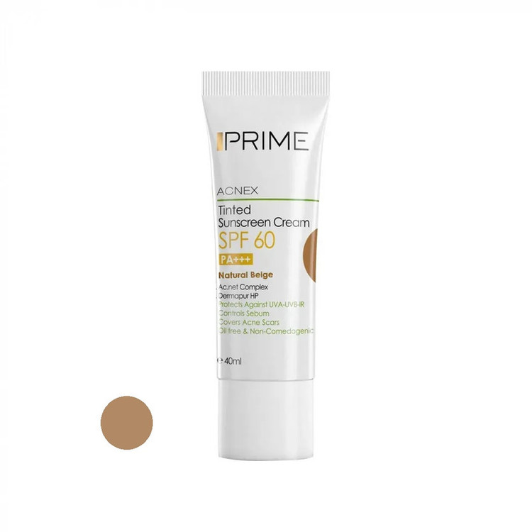 کرم ضدآفتاب رنگی پرایم، 60 SPF، مدل 02، مناسب پوست چرب و مختلط تنالیته رنگ متوسط و حجم 40 میلیلیتر، محافظت کننده در برابر اشعه UVA،IRو UVB، کنترل کننده ترشح سبوم، فاقد چربی و غیر کومدونزا، +++PA، پوشش دهنده جای جوش، با ماندگاری 3 ساعته