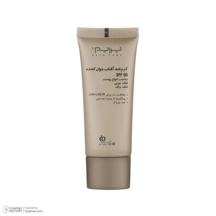 کرم ضد آفتاب بدون رنگ SPF50 یکی از محصولات کارخانه پرایم است که به عنوان محصولی ایرانی با کیفیت بالا رقیبی جدی برای همتایان خارجی خود به شمار میرود. این محصول محافظی قوی برای پوست در برابر اشعه های UVA، UVB، IR به شمار میرود. این محصول که در ساخت آن از عصاره ساقه انگور استفاده شده فاقد چربی است و میتواند انواع لک و جای جوش را بپوشاند. بهترین روش مصرف برای این کرم ضدآفتاب پوشاندن پوست با مقدار کافی از کرم 20 دقیقه قبل از قرار گرفتن در معرض نور آفتاب است. برای بهترین نتیجه بهتر از مصرف کنندهی این کرم هر 2 ساعت یک بار یک لایه جدید از کرم روی پوست خود بکشد. همچنین در مواردی مانند تعریق شدید، شنا و یا در ساعاتی از روز که تابش نور شدیدتر است میتوان ضدآفتاب را در فواصل زمانی کوتاهتر تجدید کرد. مدت انقضای این محصول که به صورت یک تیوپ ارائه شده است از طرف شرکت سازنده 36 ماه از زمان ساخت اعلام شده و حجم بطری آن 40 میلیلیتر است. این محصول که ویژهی صورت در نظر گرفته شده برای پوست آقایان و خانمها ساخته شده است. بنابر این محدودیتی در جنسیت مصرف کننده و ندارد و برای تمامی سنین نیز مناسب است. یکی از توصیههایی که پیش از مصرف لوازم آرایشی و خصوصا کرم ذکر میشود، تست حساسیت است تا از عدم بروز حساسیت در برابر مواد موجود در کرم اطمینان حاصل گردد.