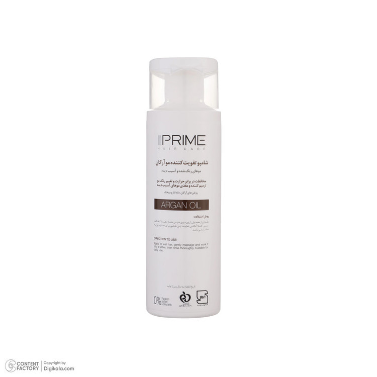 شامپو تقویت کننده مو آرگان پرایم یک شوینده ملایم فاقد سولفات و مناسب برای مصرف روزانه است که با دارا بودن روغن های آرگان، دانه انار و میخک و هم چنین دکسپانتنول، پوست سر و مو را تغذیه و رطوبت رسانی می کند. این محصول ضمن پاکسازی پوست سر، با نفوذ به ساقه مو منجر به افزایش استحکام براقی و لطافت موها شده و نرمی ابریشم مانند، به مو می بخشد. روغن آرگان موجود در این شامپو که حاوی مقادیر قابل توجهی امگا 3، 6 و 9 می باشد. ضمن افزایش الاستیسته مو سبب رطوبت رسانی به مو و پوست سر می گردد. همچنین روغن های میخک و دانه انار موجود در آن با دارا بودن ترکیبات مغذی و آنتی اکسیدانی، ضمن تقویت مو با خنثی سازی اثرات مخرب رادیکال های آزاد، به تثبیت رنگ مو کمک می کنند. دیگر ترکیب موثر موجود در این محصول آمودایمتیکون است که سبب محافظت موها در برابر حالت دهنده های حرارتی مانند سشوار و اتو مو شده، رنگ مو را تثبیت نموده و موهای خشک و آسیب دیده در اثر رنگ را نرم و درخشان می کند. این محصول برای آقایان و بانوان قابل استفاده می باشد.