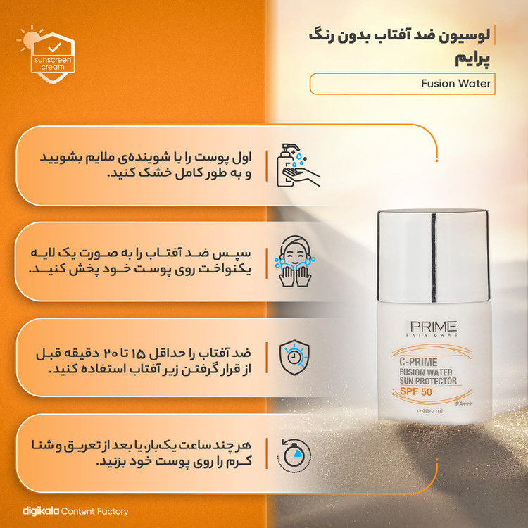 لوسیون ضدآفتاب بیرنگ پرایم با فرمولاسیون ضد آفتاب فیزیکی، محافظت کاملی از پوست در برابر اشعههای مضر UVA و UVB ارائه میدهد. این محصول با SPF 50 و PA+++، از پوست در برابر آسیبهای ناشی از نور خورشید محافظت میکند. بافت سبک و بدون رنگ این لوسیون، برای انواع پوستها مناسب است و به راحتی جذب میشود. ترکیبات این لوسیون شامل عصارههای طبیعی آفتاب گردان، گل مغربی و آلوئه ورا است که به مرطوبکنندگی و تغذیه پوست کمک میکنند. این محصول فاقد پارابن و چربی است و از ایجاد جوش و کومدون جلوگیری میکند. ویژگیهای ضد آب این لوسیون، آن را به انتخابی عالی برای استفاده در روزهای گرم و مرطوب تابستانی تبدیل میکند. این لوسیون با بافت سبک و جذب سریع، بدون ایجاد حس سنگینی یا چسبندگی، به راحتی روی پوست پخش میشود و محافظتی کامل و موثر را فراهم میکند. این محصول مناسب برای بانوان است و میتواند به راحتی در روتین روزانه مراقبت از پوست جای بگیرد.