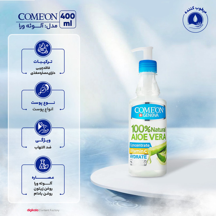 همه انسانها نگران سلامتی خود استند. یکی از نگرانیهای مهم امروزه ما، پیری پوست است که باعث احساس ناخوشایندی میشود و اعتماد بهنفس شما را کاهش میدهد. شستوشوی نادرست، ناقص وعدم پاکسازی کامل پوست از آلودگیها باعث ایجاد چین و چروک، کدرشدن رنگ پوست وایجاد لکه روی پوست شما میشود. یکی از راههای مهم و اساسی برای رسیدگی به پوست آبرسانی درست آن است. ژل آبرسان کامان مدل آلوئه ورا در حجم 400 میلی لیتر عرضه شده و آبرسان قوی و روشنکننده پوست است. این محصول ضدحساسیت، التهاب، سوزش و قرمزی است. ژل آبرسان کامان مدل آلوئه ورا کمک به درمان جای زخم، بريدگى هاى سطحى، خراشيدگى، نيش حشرات و لک جوش از روى پوست میکند و حاوى تركيبات آنتىاكسيدان براى جلوگيرى از اثرات مخرب راديكالهای آزاد است. ژل آبرسان کامان مدل آلوئه ورا مناسب برای انواع پوست حتی پوستهای خشک و حساس بوده و حاوی ویتامین C است. گفتنی است این محصول به درمان آفتابسوختگی کمک بسیاری میکند.