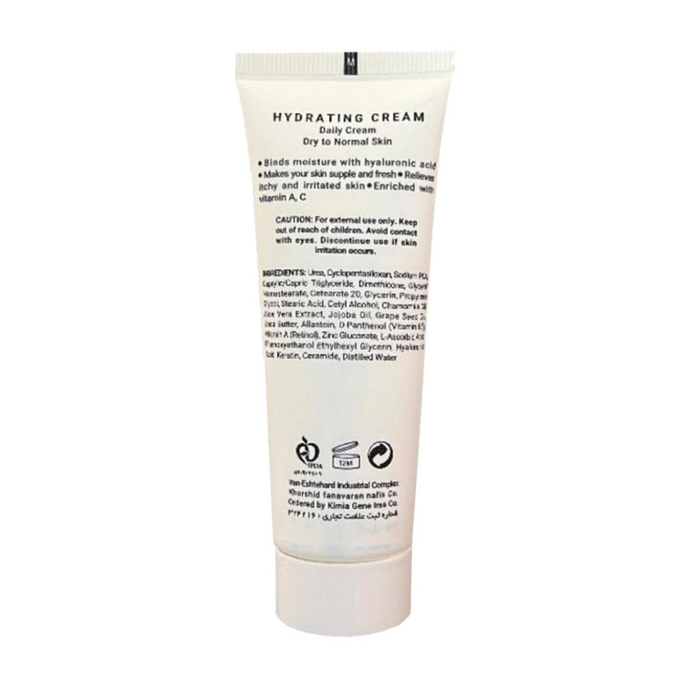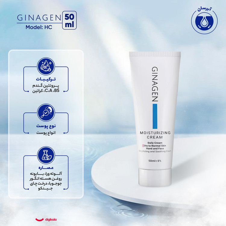 کرم آبرسان ژیناژن، مدل HC، مناسب پوستهای نرمال تا خشک، حاوی ویتامینهای A و C، هیالورونیک اسید و کراتین، جوانسازی پوست و تحریک سنتز کلاژن، مناسب استفاده برای دست و صورت، حجم 50 میلیلیتر