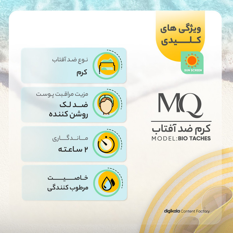 سایر مشخصات : ضد آفتاب ام کیو ضد لک محافظت کامل و زیبایی را به پوست شما هدیه می دهد. این کرم بافتی سبک و جذبی سریع بر روی پوست دارد و احساس سنگینی بر روی پوست ایجاد نخواهد کرد.