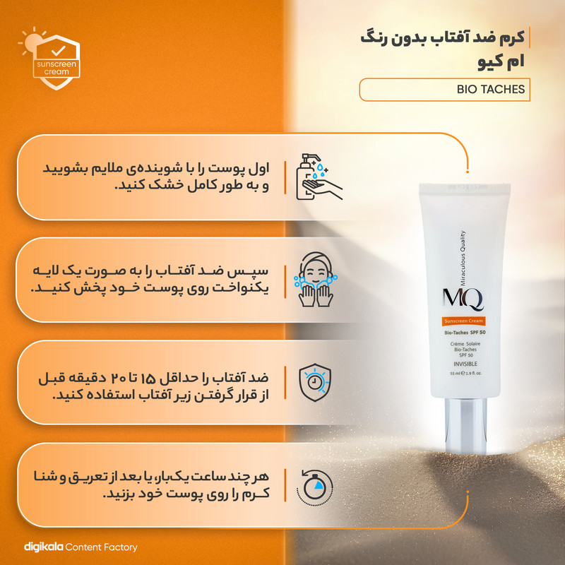 راهنمای استفاده : 30 دقیقه قبل از قرار گرفتن در معرض تابش نور خورشید از کرم ضد آفتاب ام کیو MQ مدل بایوتچ بر روی پوست خود بمالید.