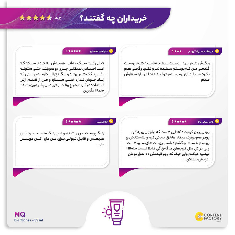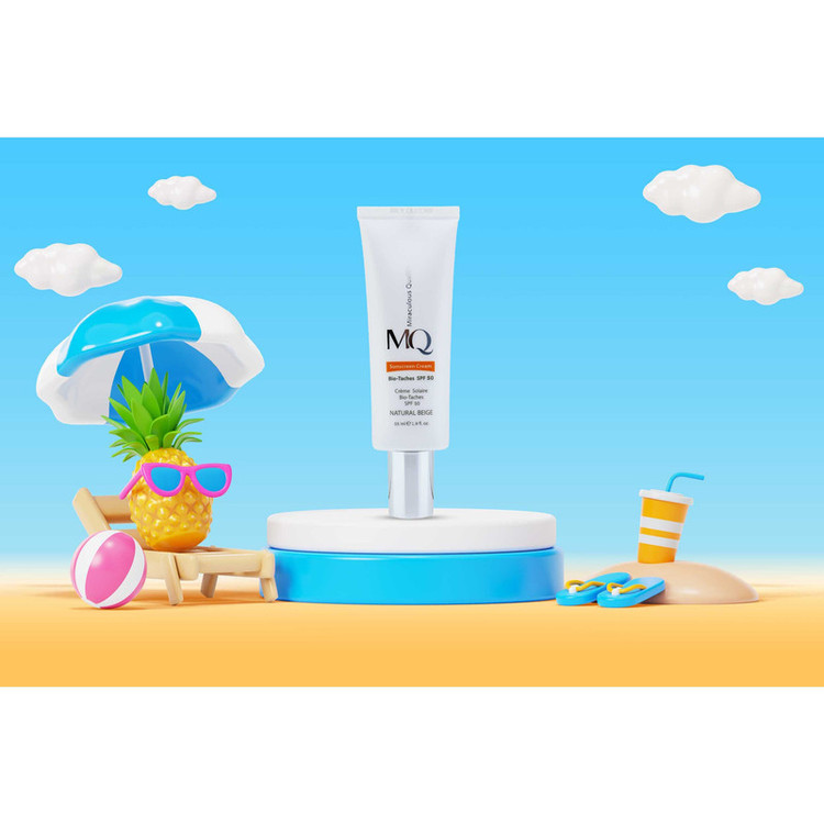 محصولات MQ ساخته شده از مواد با کیفیت می باشد. این محصولات در یکی از معتبرترین لابراتوارهای فرانسه و زیر نظر اساتید فن در صنعت مراقبت از پوست و مو فرموله شده است. این کمپانی کرم های ضد آفتاب خود را روانه بازار کرده است که ساخته شده از مرغوبترین و جدیدترین مواد اولیه و دارای حداکثر حفاظت در برابر پرتوهای مضر آفتاب هستند. این محصولات دارای ساختاری سبک بوده نرمی و لطافت را به پوست بازمی گرداند. یکی از این محصولات بسیار با کیفیت این برند، کرم ضد آفتاب بایوتچ SPF 50 است. که در سه رنگ بژ طبیعی، بژ روشن و بدون رنگ موجود است. که قويترين و موثرترین ضدآفتاب با دو عملکرد (ضدآفتاب + ضدلک) است و مناسب برای پوست های دارای لک همراه با خاصیت روشن کنندگی می باشد. لذا انواع لک، کک ، لک های ناشی از آفتاب، جای جوش،بارداری و افزایش سن را برطرف می کند. همچنین از ایجاد لک خصوصا در افرادی که مستعد ابتلا به لک های ناشی از آفتاب هستند، پیشگیری می کند. و علاوه بر این محافظ قوی پوست در برابر تاثیرات مخرب اشعه های مضر UVA و UVB به حساب می آید. و با خاصیت مرطوب کنندگی و التیام بخشی برای انواع پوست مناسب است. جهت استفاده نیم ساعت قبل از قرار گرفتن در معرض اشعه آفتاب روی پوست تمیز مالیده شود و هر دو ساعت یکبار آن را تجدید کنید.