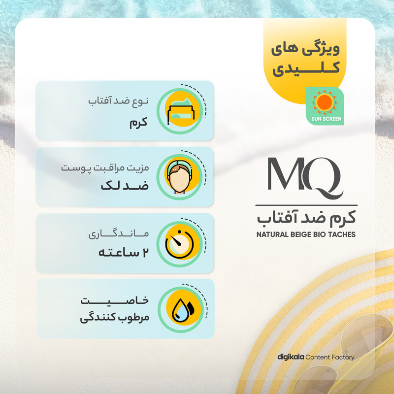 محصولات MQ ساخته شده از مواد با کیفیت می باشد. این محصولات در یکی از معتبرترین لابراتوارهای فرانسه و زیر نظر اساتید فن در صنعت مراقبت از پوست و مو فرموله شده است. این کمپانی کرم های ضد آفتاب خود را روانه بازار کرده است که ساخته شده از مرغوبترین و جدیدترین مواد اولیه و دارای حداکثر حفاظت در برابر پرتوهای مضر آفتاب هستند. این محصولات دارای ساختاری سبک بوده نرمی و لطافت را به پوست بازمی گرداند. یکی از این محصولات بسیار با کیفیت این برند، کرم ضد آفتاب بایوتچ SPF 50 است. که در سه رنگ بژ طبیعی، بژ روشن و بدون رنگ موجود است. که قويترين و موثرترین ضدآفتاب با دو عملکرد (ضدآفتاب + ضدلک) است و مناسب برای پوست های دارای لک همراه با خاصیت روشن کنندگی می باشد. لذا انواع لک، کک ، لک های ناشی از آفتاب، جای جوش،بارداری و افزایش سن را برطرف می کند. همچنین از ایجاد لک خصوصا در افرادی که مستعد ابتلا به لک های ناشی از آفتاب هستند، پیشگیری می کند. و علاوه بر این محافظ قوی پوست در برابر تاثیرات مخرب اشعه های مضر UVA و UVB به حساب می آید. و با خاصیت مرطوب کنندگی و التیام بخشی برای انواع پوست مناسب است. جهت استفاده نیم ساعت قبل از قرار گرفتن در معرض اشعه آفتاب روی پوست تمیز مالیده شود و هر دو ساعت یکبار آن را تجدید کنید.