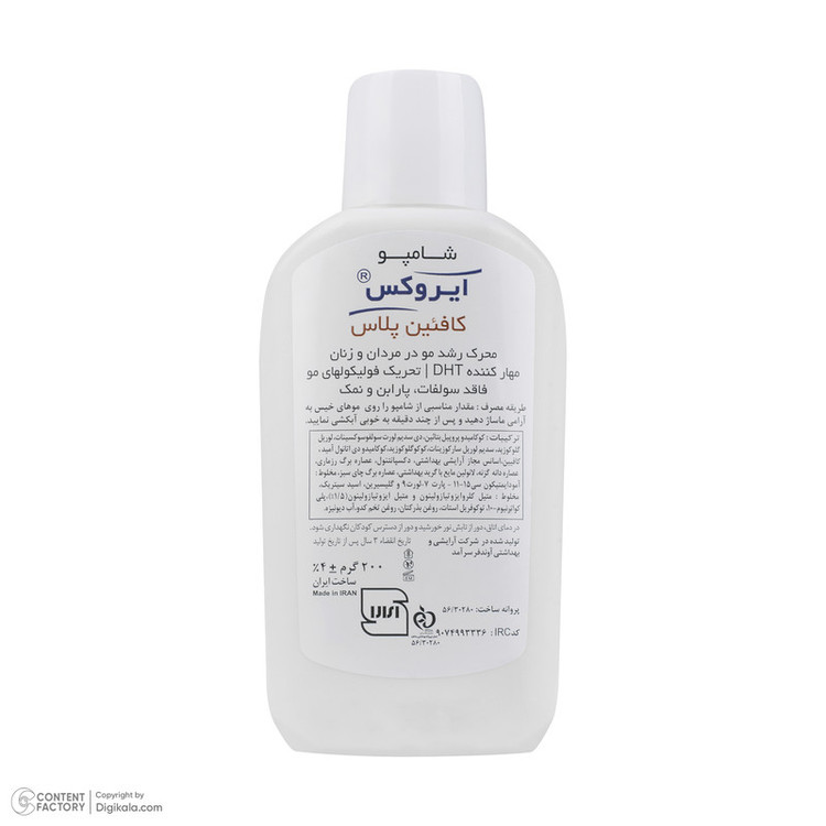 شامپو کافئین پلاس ایروکس فاقد سولفات ،پارابن و نمک بوده و با شویندگی ملایم و PH سازگار با پوست سر و مو با مهار آنزیم ردوکتاز سبب کاهش سطح DHT و جلوگیری از ریزش مو با الگوی مردانه و زنانه می شود و با داشتن کافئین و عصاره های گیاهی مهار کننده DHT و افزایش گردش خون محیطی سبب کاهش ریزش و تحریک فولیکول مو می گردد.