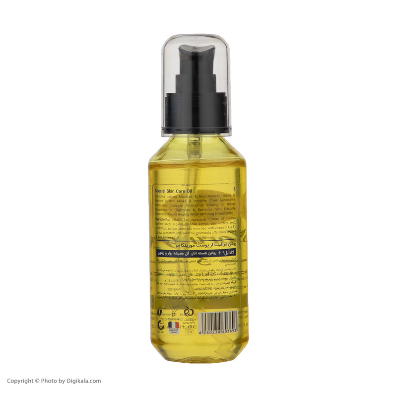 سایر مشخصات : پيشگيری از ترکهای پوستی (استرچ مارک) و بهبود ظاهر آنهاتحریک توليد کلاژن و بهبود استحکام پوستترميم زخم همراه با کاهش التهابتغذيه، آبرسانی و افزایش نرمی و لطافت پوستجلوگيری از آسيبهای ناشی از نور خورشید و آلودگیهای محیطی