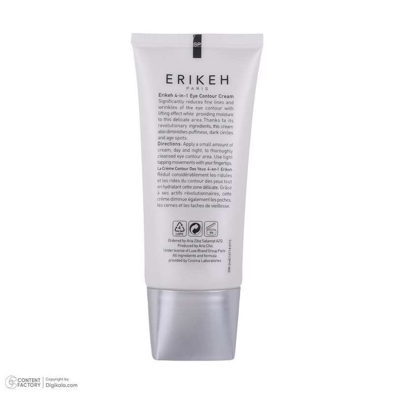 خستگی، استرس و اضطراب می تواند باعث شود چهره ی شما بسیار خسته دیده شود و تیرگی و پف زیر چشم شما را افزایش دهد. با استفاده از کرم دور چشم 4 در 1 اریکه می توانید سلامتی را به زیر چشمان خود باز گردانید. این کرم دور چشم با فرمولاسیون ویژه ای که درون خود دارد می تواند با افزایش جریان لنف در پوست زیر چشم، تیرگی های زیر چشم را کاهش داده و می تواند باعث روشن شدن و شفافیت پوست زیر چشم شود. ترکیبات مرطوب کننده موجود در این کرم باعث می شوند که از خشکی پوست اطراف چشم جلوگیری کرده و با افزایش الاستین به انعطاف پذیری و لیفت این قسمت از صورت جلوگیری می کند. حاوی فیلتر های ضد آفتاب و خواص آنتی اکسیدانی بوده که می تواند از آفتاب سوختگی و آسیب دیدگی های رادیکال های آزاد جلوگیری کرده و در نتیجه پوست اطاف چشم سالم بماند. کرم دور چشم اریکه از افتادگی پلک جلوگیری کرده و مانع از ایجاد پف زیر چشم می شود. موادی که درون کرم دور چشم اریکه به تخلیه ی آب میان بافتی کمک می کنند، کاهش پیدا کرده و باعث می شوند که پوست زیر چشم سرحال و شاداب شود. علاوه بر موارد گفته شده می توان چین و چروک هایی که در اطراف چشم بوجود آمده باشد را کاهش داده و باعث جوانسازی پوست شد.