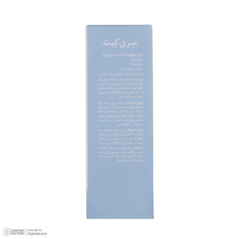 متاسفانه این کالا در حال حاضر موجود نیست. میتوانید از طریق لیست بالای صفحه، از محصولات مشابه این کالا دیدن نمایید.همانطور که میدانید فعالیتهای فیزیکی روزانه باعث میشود که کف پا به ویژه پاشنهها مستعد خشکی و ترک شوند. ترکهای عمیق مراقبت نشده در کف پا علاوه بر ظاهر ناخوشایند، میتوانند عفونی شده و این عفونت به درون زخم گسترش یابد. به همین خاطر لازم است از یک کرم پا مناسب استفاده نمایید تا از مشکلات بعدی نیز پیشگیری کنید. در این میان کرم مرطوب کننده پا سری کیت با مجموعه ای از عوامل لایه بردار و مرطوب کننده قوی علاوه بر حذف سلولهای پوستی مرده و خشک، زبرترین پاها را نرم و لطیف میکند. همچنین برای لطافت بخشی به سایر نواحی زبر و خشک نظیر زانو، آرنج و دست نیز مناسب است. این محصول به علت عدم استفاده از اوره، برای افراد دیابتیک نیز قابل استفاده است.