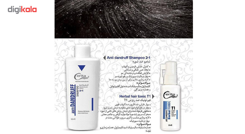 شامپو ضد شوره ۲ در ۱ سریتاAnti Dandruff ۲*۱ shampoo ، مناسب برای آقایان و خانم ها و مناسب برای انواع مو، با بهره گیری از تکنولوژی روز دنیا و استفاده از مواد موثر مفید و کارآمد، تاثیر بسزایی در درمان و کنترل شوره سر، رفع پوسته های سفید رنگ، و درمان خارش پوست سر دارد. همچنین این شامپو به دلیل فرمولاسیون منحصر به فرد خود دارای خواص ضد شوره، تقویت کننده با خواص ضد قارچی، آنتی باکتریال همراه با ویژگی رایحه درمانی نموده است. از ویژگی های این شامپو می توان به موارد زیر اشاره کرد: افزایش رطوبت رسانی به ساقه موی آسیب دیده و ایجاد حس خنکی و شادابی و آرام بخشی ، رفع پوسته ریزی (کراتولیتیک) و پاكسازی مو از ورقه ها و فلس های سفید رنگ، تنظیم چربی پوست سر و مهار رشد قارچ عامل شوره، حاوی اسید سالیسیلیک ۱%، BHA (لایه بردار)، افزایش لطافت و درخشندگی مو، کنترل التهاب و خارش پوست و کنترل انواع شوره. هیر تونیک T۱ سریتا Cerita Herbal Tonic T۱ تقویت کننده و ضد شوره سریتا با بهره گیره از تکنولوژی روز دنیا و استفاده از مواده موثره مفید و کارآمد، تاثیر بسزایی در درمان و کنترل شوره های مقاوم، درماتیت سبورئیک، رفع پوسته های سفید رنگ و درمان خارش پوست سر دارد. همچنین این محصول باعث تقویت موهای سر نیز می شود. از ویزگی های این محصول موارد زیر می باشد: مهار خارش ، ضد قارچ و ضد التهاب قوی، موثر در رفع انواع شوره های مقاوم به درمان (سر و ابرو)، محلولی فرموله شده برای درمان ریزش های ناشی از شوره، محرک سریع رشد مو با مواد موثره گیاهی و عناصر معدنی، لایه برداری مناسب با اثری سریع و طولانی مدت در مهار درماتیت سبورئیک.