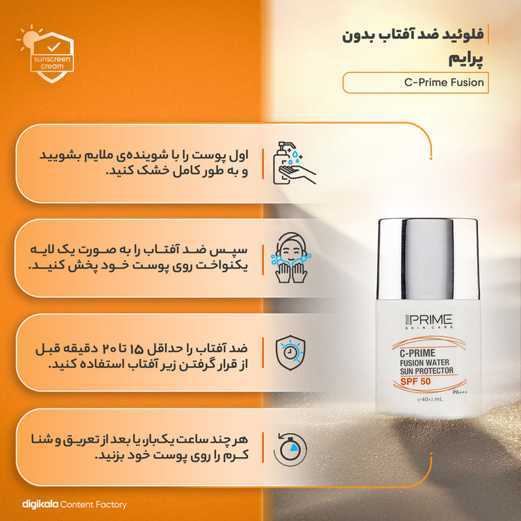 فلوئید ضدآفتاب بی رنگ پرایم SPF 50 مدل C-Prime Fusion Water یک محصول مراقبت از پوست است که بر پایه آب تولید شده و بافت بسیار سبکی دارد که به سرعت توسط پوست جذب میشود. این محصول سازگاری بسیار خوبی با انواع پوست دارد و مناسب برای استفاده تمامی افراد میباشد. یکی از ویژگیهای مهم این کرم، SPF50 آن است که پوست را از اشعههای مضر آفتاب محافظت میکند و از ایجاد لک بر روی پوست جلوگیری میکند. این کرم به سرعت جذب شده و هیچ چربی اضافهای به همراه ندارد و لک سفیدی روی پوست باقی نمیگذارد. با استفاده از فلوئید ضد آفتاب پرایم، پوست مرطوب و آبرسان شده و از خشکی و پیری زودرس جلوگیری میکند. علاوه بر حفاظت از پوست در برابر اشعه آفتاب، این کرم باعث جوانسازی، روشنایی و افزایش زیبایی پوست میشود.