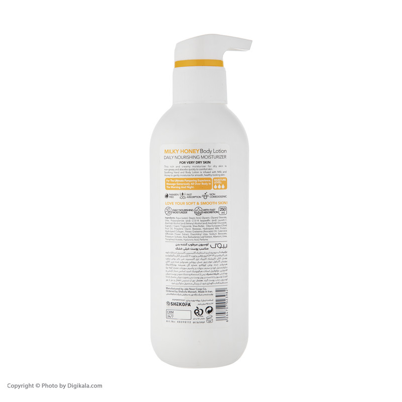 راهنمای استفاده: پس از استحمام و خشک نمودن پوست، لوسیون را با دست بر روی پوست بدن به صورت دورانی ماساژ داده تا لوسیون جذب پوست گردد.
